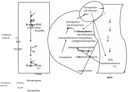 3) Под действием фермента НАДФН-зависимой биливердинредуктазы биливердин восстанавливается до билирубина (пигмент красно-жёлтого цвета). Затем клетки РЭС выделяют в кровь свободный билирубин.
