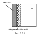 м – потенциал или работа выхода электрона с поверхности металла; s – потенциал или работа выхода электрона с поверхности полупроводника. Если м > s, тогда электроны из металла перейдут в полупроводник, рекомбинируются с дыркой и вблизи контакта образуется слой бедным основными носителями, а образовавшийся объемный заряд акцепторной примеси установит динамическое равновесие, аналогичное тому, как это происходит на n-p-переходе.