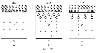 Диэлектрические пленки SiO2 всегда содержат донорные примеси. Это объясняется тем, что растворы, применяемые для обработки поверхности кремния и окисла, а также посуда и оснастка, используемая в технологическом процессе, содержит именно донорные составляющие. Эти донорные примеси сосредотачиваются вблизи границы Si-SiO2 и электроны, ушедшие из окисла кремния, оставляют неподвижные положительные ионы в SiO2, а переходя в полупроводник, либо обогащают, либо обедняют приповерхностный слой в зависимости от типа полупроводника (рис. 1.36,а,б,в).