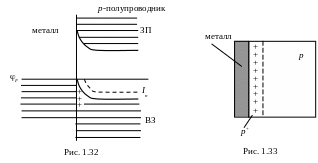 Если взять р-полупроводник и металл, но подобрать эту пару такой, чтобы потенциал выхода у металла был больше, чем у полупроводника (рис. 1.32), то в этом случае электроны из полупроводника уйдут в металл и вблизи границы получается слой обогащенный основными носителями т.е. слой с меньшим удельным сопротивлением (рис. 1.33).