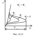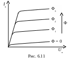 Конструктивно они устроены также, как и обычные транзисторы, только в корпусе предусмотрено светопроницаемое окно и толщина эмиттера является проницаемой для светового потока, который облучает база-эмиттерный переход. В этом случае за счет фотогальванического эффекта на переходе появляются дополнительные носители, которые усиливаются транзистором, создавая коллекторный ток в раз больше базового тока. Вольтамперная характеристика (рис. 6.11) имеет такой же вид, что и в обычных транзисторах, но семейство характеристик получается при разных световых потоках (Ф).