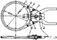 1 — диск; 2 — серьга; 3 — проушина винта; 4 — винт; 5 — дистанционная втулка; 6 — планка; 7 — рукоятка.