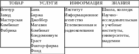 Обычно наименование организационной формы определяется видом выпускаемой продукции: товара, услуг, информации и знаний, поэтому перечисленные в качестве примера организации могут быть распределены следующим образом (рис. 29).
