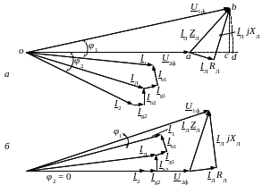 Рис. 3.2. Векторные диаграммы ЛЭП: а – режим активно-индуктивной нагрузки; б – режим активной нагрузки
