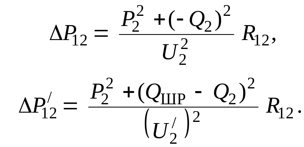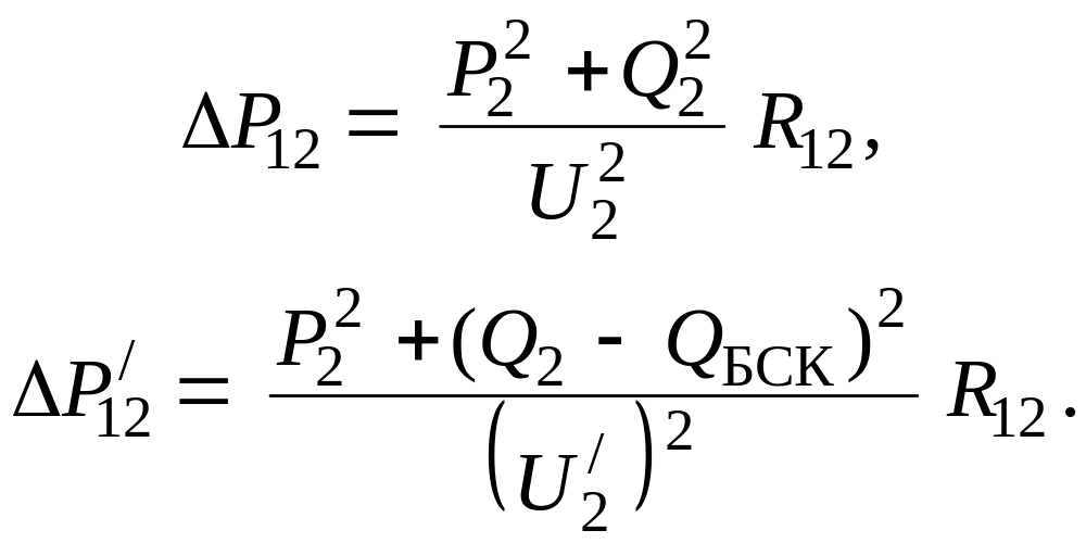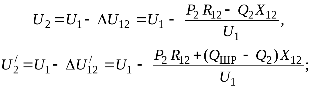Если не учитывать поперечную составляющую падения напряжения, то напряжение в узле 2 до и после установки БСК будет равно соответственно: