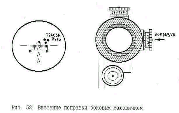 Поправка в установку бокового маховичка вносится на величину отклонения пуль по боковому направлению в тысячных, измеренную с помощью шкалы боковых поправок сетки прицела (рис. 52).
