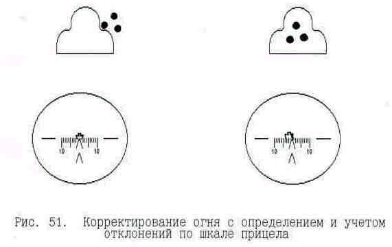 Если отклонение пуль от цели сравнительно велико и обстановка позволяет изменять установки прицела и бокового маховичка, то корректирование огня производится введением поправок в прицел и боковой маховичок.