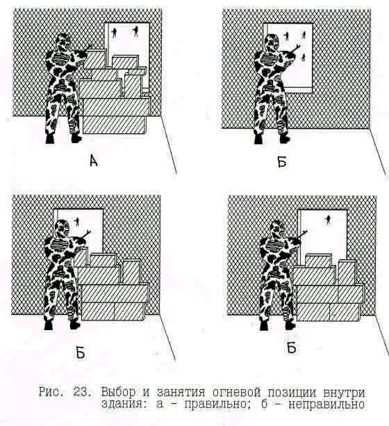 При ведении огня из здания не следует подходить близко к окну или пролому, а огонь необходимо вести из глубины помещения. Это ограничивает видимость вспышки противником и в некоторой степени поглощает звук выстрела (рис. 23).