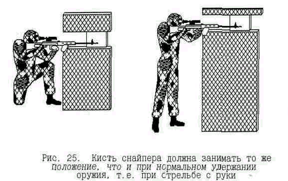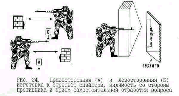 В уличных боях снайпер может выбрать огневую позицию в подбитой боевой технике, в груде кирпичей, железа, в полуподвальных помещениях, за трубами на крышах, за заборами и т.п. Для этого снайперу необходима специальная подготовка для умения вести огонь с левого плеча (рис. 24).