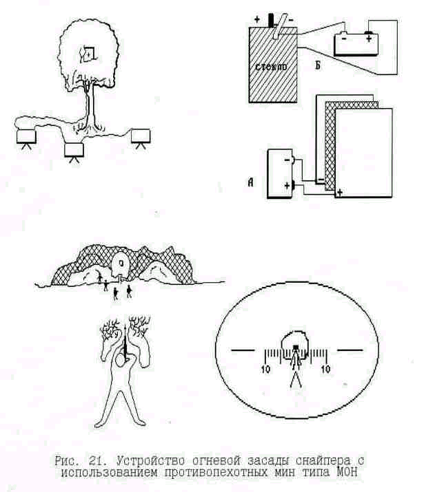 В горах огонь снайперов особенно надежно должен прикрывать дороги, выходы из ущелий, теснин, удобные переходы через реки и каньоны. Места для огневых позиций выбираются на скатах господствующих высот, обращенных к противнику (рис. 20в), а при обороне в узкой горной долине - на прилегающих скатах гор, обеспечивающих пострел долины перекрестным огнем на предельную дальность. Вероятные маршруты выхода противника минироваться и подрываться огнем снайпера (рис. 21).