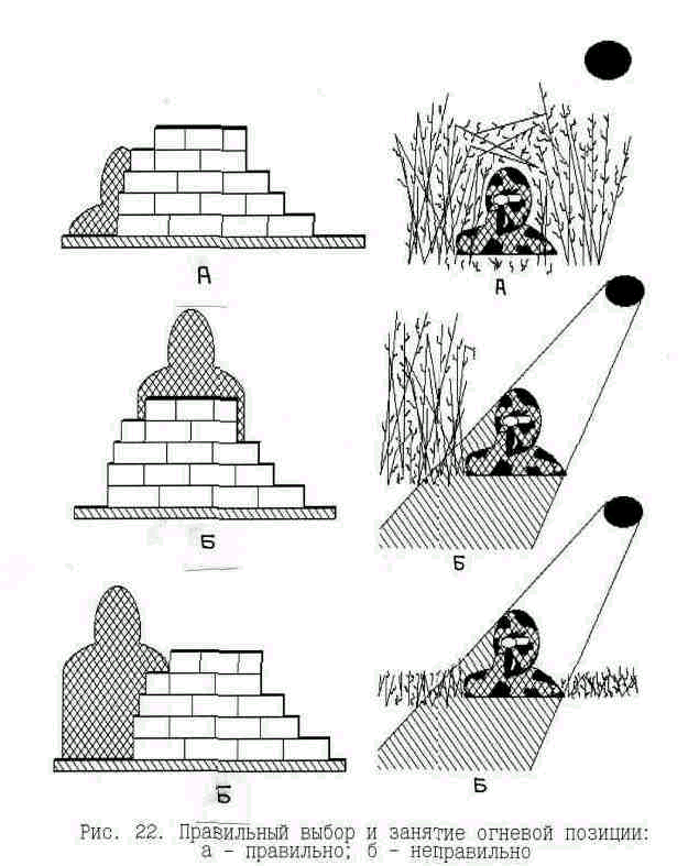 в-третьих, не следует располагаться на открытых гребнях высот или на поверхности местных предметов, чтобы не проектироваться на фоне неба, на светлых или ярко освещенных участках местности нужно занимать место в тени или на фоне местности (рис. 22), соответствующем цвету формы одежды снайпера. Снайперу надо искусно применяться к местности и строго соблюдать правила маскировки.