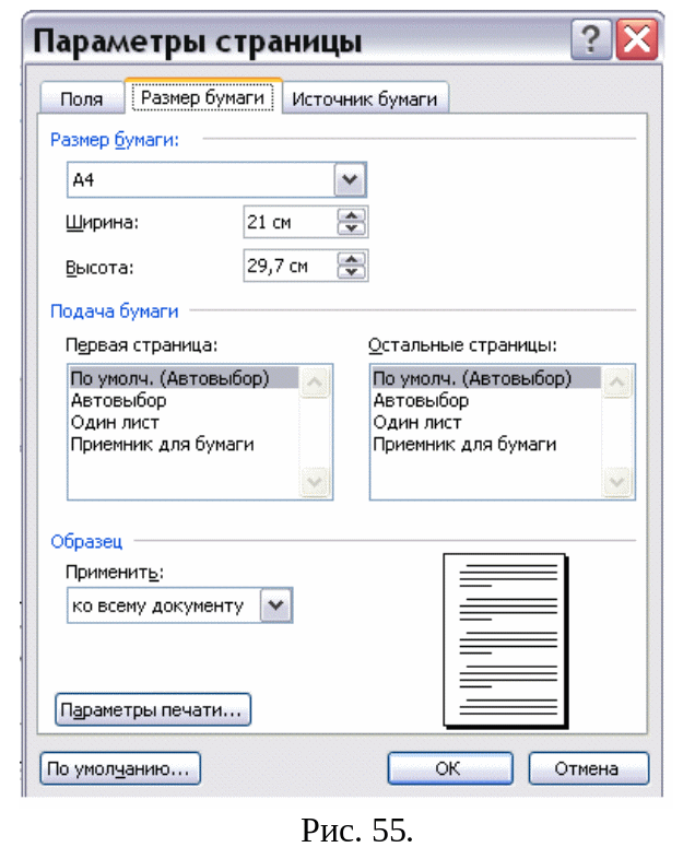 Размеры бумаги устанавливаются на закладке «Размер бумаги» в разделе «Размер бумаги» с помощью кнопок «вниз» в меню стандартных форматов бумаги А4 (или А5, …, разное) и с помощью кнопок «вверх» и «вниз» в меню «Ширина» и «Высоты» (рис. 55.).
