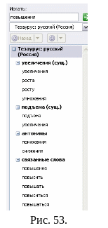 В приведенном примере осуществляется поиск синонима к слову «повышения». Как видно из примера, для выбора синонима необходимо определить значение, в котором употреблено выделенное слово (Рис. 53.).