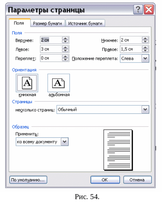 Для настройки параметров страницы выберите в Меню Файл Параметры страницы. Откроется окно «Параметры страницы» (рис. 54.). Окно можно условно разделить на две части. В верхней части расположен список настраиваемых параметров, а в нижней - образец страницы документа, в котором отображаются результаты изменения параметров. Слева от образца размещено «окно меню», с помощью которого можно указать, к какой части документа необходимо применить новые параметры. По умолчанию новые параметры страницы распространяются на весь документ.