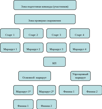 Обобщая все вышеотмеченные способы увеличения пропускной способности дистанции и возможности участия в соревнованиях команд различной подготовленности без их отсеивания, можно представить некоторую обобщенную принципиальную схему (рис.4).