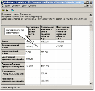 Ввод информации из загрузочных форм в хранилище данных осуществляется в программе «Комбайнер», (в меню операционной системы «Пуск/Программы/InfoVisor/Загрузка данных» пункт «Комбайнер»), входящий в состав ИАС ТЭБ. Вводимую загрузочную форму необходимо открыть в «Комбайнере», воспользовавшись пунктом меню «Файл/Открыть». При этом загрузочная форма появится в рабочей области программы (рис. 4.2 ). На данном этапе загрузочная форма доступна для редактирования: можно изменять или удалять значения в ячейках.