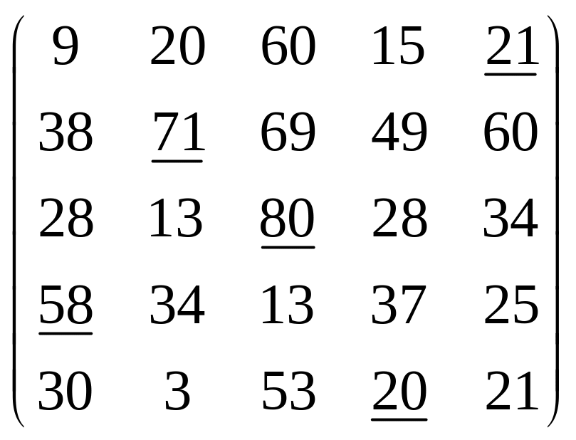 Підкреслюємо відповідні елементи вихідної матриці. Оптимальне рішення: на склад А призначити механізм V, на склад Б механізм ІІ, на склад В механізм ІІІ, на склад Г механізм І, на склад Д механізм IV. Максимальна продуктивність складе 58+71+80+20+21 = 250 т/зміну. |
