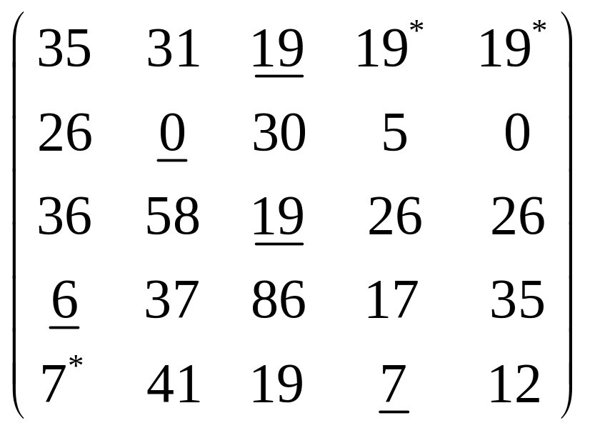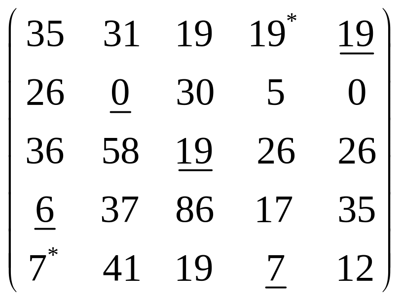 Крок 7. Підкреслюємо елемент 19 у стовпчику 5, знімаємо з нього позначку “*”. Крок 8. Знімаємо підкреслення з елементу 19 у стовпчику 3 рядка 1. Крок 9. Переглядаємо стовпчик 3, у якому була знято підкреслення. Він має лише один підкреслений елемент у рядку 3. Переходимо до кроку 10. Крок 10. У матриці не залишилось жодного стовпчика, у якому немає не підкреслених елементів. Таким чином, знайдене оптимальне рішення. |