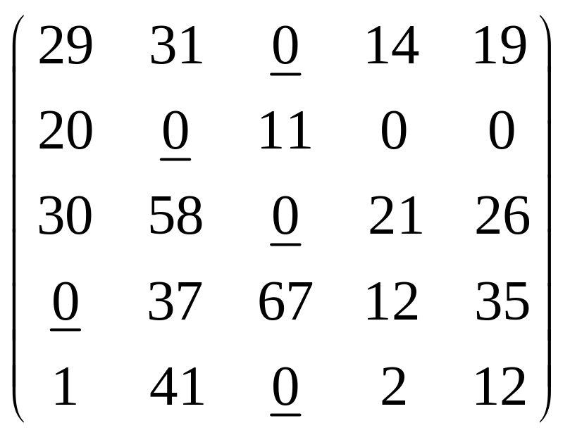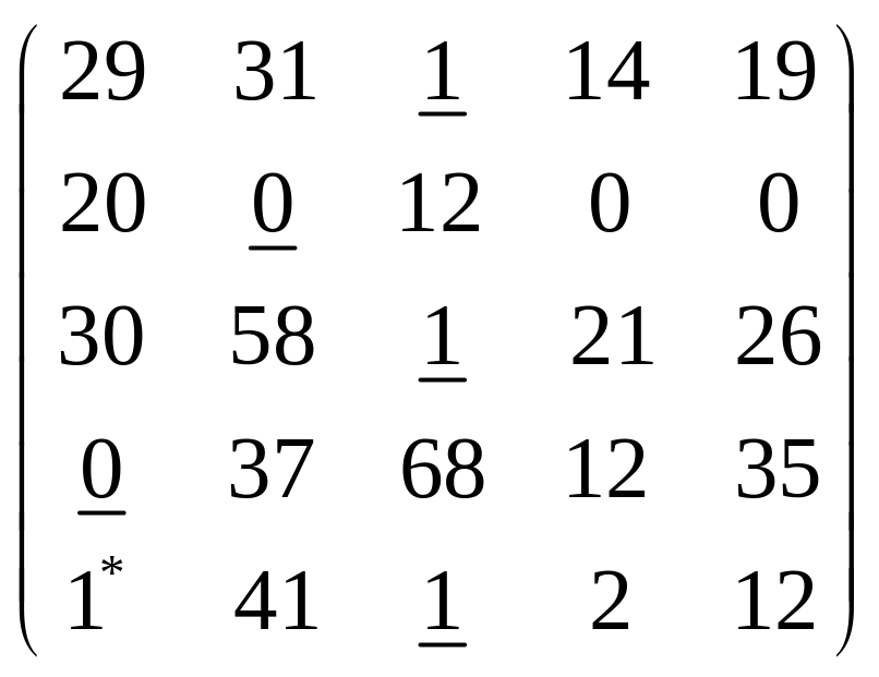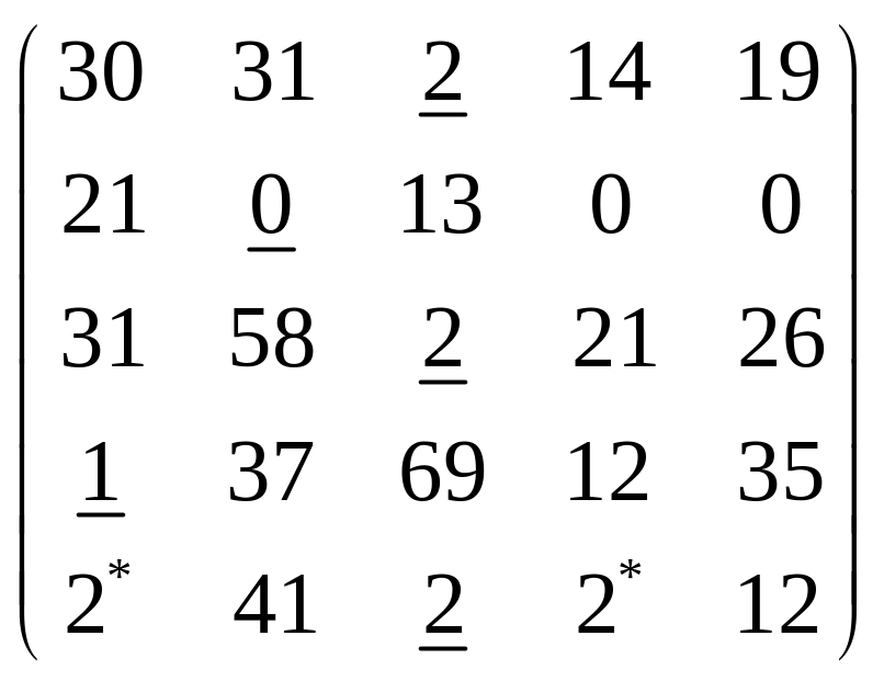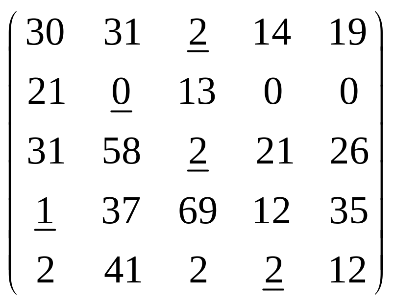 Крок 1. Знаходимо у рядках матриці мінімальні елементи та підкреслюємо їх. У стовпчиках 4 та 5 немає жодного підкресленого елементу, тому переходимо до кроку 2. |