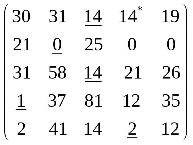 Крок 3. Переглядаємо рядки стовпчиків 3 та 4: – рядок 1: підкреслений елемент 14, мінімальна різниця 19–14 = 5; – рядок 3: підкреслений елемент 14, мінімальна різниця 26–14 = 12; – рядок 5: підкреслений елемент 2, мінімальна різниця 2–2 = 0. Мінімальна різниця 0 досягається у рядку 1. |