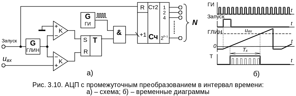 На рис. 3.10, а представлена схема АЦП с промежуточным преобразованием входного сигнала (напряжения) в пропорциональный ему временной интервал tи который затем заполняется счетными импульсами эталонной частоты fсч. Число импульсов, попавших в измерительный интервал Тx, фиксируется счетчиком и выдается как цифровой эквивалент преобразуемого сигнала (рис. 3.10, б). При этом соотношение между кодом и входным сигналом имеет следующий вид: