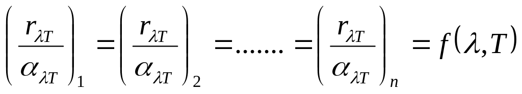 Кирхгофом был сформулирован закон, устанавливающий указанное выше положение: отношение лучеиспускательной способности к коэффициенту поглощения не зависит от рода тел и является для всех тел одной и той же функций от длины волны и температуры: