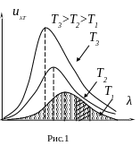 площадью под кривой uT. С ростом температуры увеличивается интенсивность теплового движения частиц тела и возрастает энергия, излучаемая телом как на данной длине волны , так и во всем интервале длин волн. Поэтому при Т3 > T2 > T1 поднимается вся спектральная кривая uT теплового излучения, как показано на рис.1.