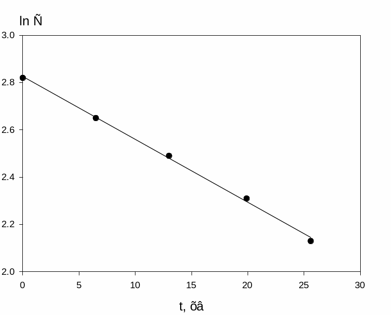 Залежність концентрації вихідної речовини від часу лінійна у координатах lnСi=f() (рис.2а). Таким чином, реакція (1) є реакцією першого порядку.