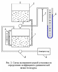 В исходном состоянии оба клапана (4 и 6) закрыты. Перед началом измерений клапан 4 открывают и включают компрессор. В результате нагнетания в емкость 1 воздуха, находящаяся в ней вода начинает подниматься в емкость 2. Когда почти вся вода окажется в емкости 2 (о чем судят по показаниям измерительной трубки 3), компрессор выключают, а клапан 4 закрывают. После этого открывают клапан 6, соединяя таким образом емкость 1 с окружающим пространством через клапан 7. В результате вода из емкости 2 начинает медленно возвращаться в емкость 1, вытесняя находящийся в ней воздух через капилляр 7 в окружающее пространство. По прошествии некоторого времени наступит такое состояние системы, когда объем поступающей в единицу времени в емкость 1 воды окажется равным объему покидающего эту емкость воздуха – система войдет в стационарный режим. Поскольку скорость течения воздуха по капилляру мала, его можно считать ламинарным, что позволяет использовать формулу Гагена–Пуазейля (12).
