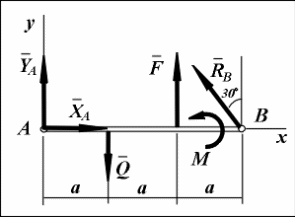 MА (Fi) = - Q · a + F · 2a + M + (RB cos 30°) · 3a = 0; (2)