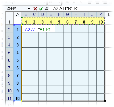 Excel также не позволит свободно перемещать ячейки, входящие в формулу массива или добавлять новые строки-столбцы-ячейки в диапазон формулы массива (т.е. в диапазон A10:H11 в нашем случае)