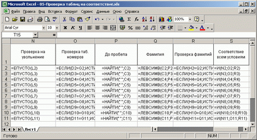 Рис. 5.22. Рабочий лист с формулами для определения соответствия двух таблиц |