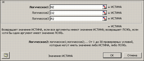 где логическое_значение 1, логическое_значение2, ... - это проверяемые условия (их может быть от 1 до 30), которые имеют либо значение "ИСТИНА", либо значение "ЛОЖЬ". Аргументы функции должны быть логическими значениями, массивами или ссылками, содержащими логические значения. В нашем случае результаты сравнений находятся в ячейках N2, О2 и R2. Вызвав панель функции И (рис. 5.20), введите в качестве ее аргументов ссылки на эти ячейки. В ячейке S2 появится новая формула: