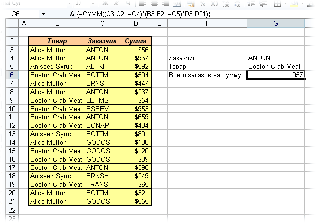 В данном случае формула массива синхронно пробегает по всем элементам диапазонов C3:C21 и B3:B21, проверяя, совпадают ли они с заданными значениями из ячеек G4 и G5. Если совпадения нет, то результат равенства ноль, если совпадение есть, то единица. Таким образом суммы всех сделок, где заказчик не ANTON и товар не Boston Crab Meat умножаются на ноль и суммируются только нужные заказы.