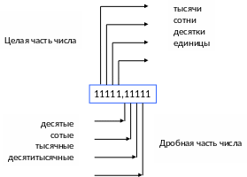 Числа состоят из целой и дробной частей. Дробную часть числа принято записывать в виде десятичной дроби. Каждая цифра в числе стоит на определенном месте, которое называется разрядом. Разряды с их наименованиями изображены ниже на схеме.
