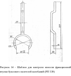 Если высота комплекта фрикционного гасителя менее 83 мм или диаметр втулок менее 81 мм, а также при отсутствии устройства контроля предельных износов деталей гасителей в соответствии с рисунком 9 комплект разбирают. Детали фрикционного гасителя проверяют шаблонами в соответствии с "Методическими указаниями контроля СДК для колесных пар, редукторно-карданных приводов вагонных генераторов и тележек пассажирских вагонов" РД 32: ЦЛ 036-92.