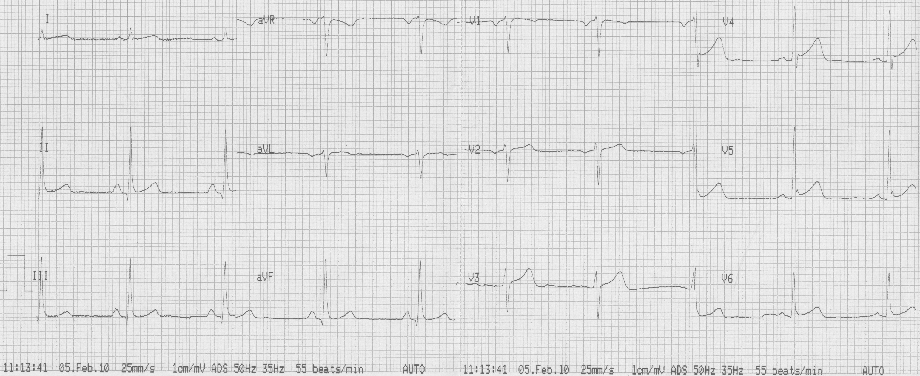 5.Укорочение, при нарастании гиперкалиемии – удлинение интервала PQ, прогрессивное нарушение атриовентрикулярной проводимости вплоть до полной поперечной блокады.