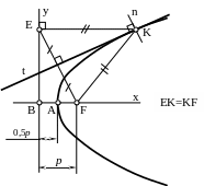 Расстояние КF между директрисой и фокусом называется параметром p параболы. Точка О, лежащая на оси симметрии, называется вершиной параболы и делит параметр p пополам.