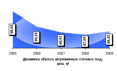 Объем сброса сточных вод в поверхностные водные объекты в 2009 г. составил 120,97 млн. м3, в том числе загрязненных сточных вод – 88,43 млн. м3 (73,1%), из которых 8,88 млн. м3 (10%) – без очистки; нормативно очищенных сточных вод – 4,25 млн. м3 (3,5%), нормативно чистых – 28,29 млн. м3 (23,4%).