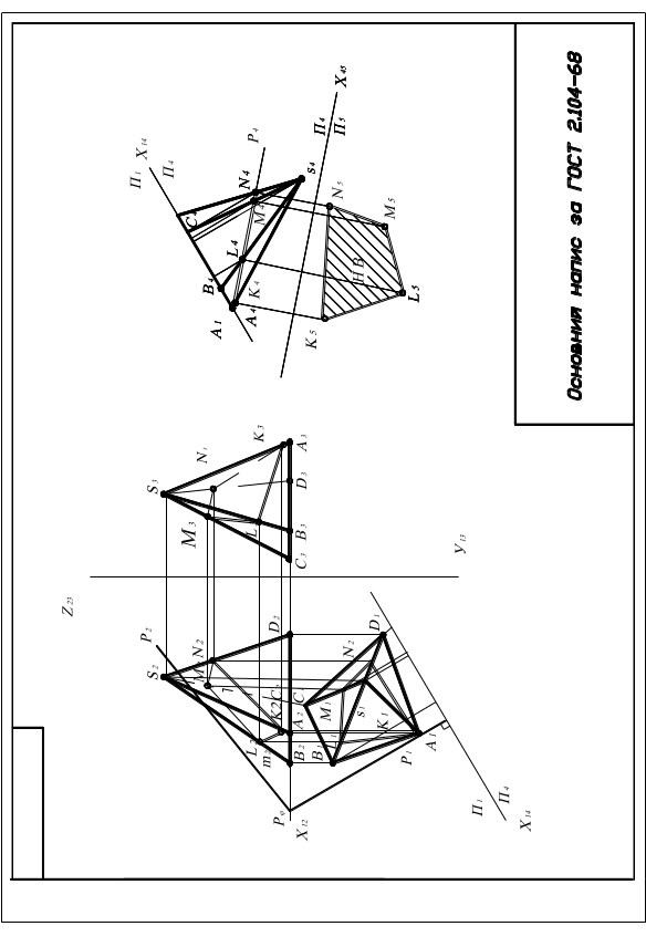 Для побудови лінії перетину потрібно шукати точки перетину бокових ребер багатогранника з площиною або накладати допоміжні січні площини [1, с.38-39, рис. 1.38 б; 2, с.114, 170-180; 3, с.185; 4, с.61-64, 150-156; 5, с.156-166; 6, с.167-169, 176-178]. Оскільки площина Р є площиною загального положення, то доцільно замінити площину проекцій так, щоб у новій системі площин проекцій задана січна площина стала проекціювальною [2, с.181-183; 4, с.96-97, рис. 98, с.160-161, рис.170; 5, с.166-168; 6, с.353, 369].