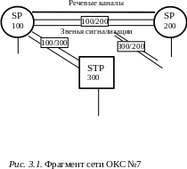 Описание: SP 100, 200, 300 – пункты сигнализации; SТP 300 – выполняет функции транзитного пункта; речевые каналы организованы только между пунктами сигнализации SP 100 и SP 200, которые могут работать как в связанном режиме (звенья сигнализации в направлении 100/200), так и в квазисвязанном (через транзитный пункт STP 300 и звенья сигнализации 100/300 и 300/200). В каждом пункте сигнализации составлены таблицы предписанных маршрутов сигнальных сообщений, например, в SP 100 для связи с SP 300 используются звенья 100/300, а для связи с SP 200 организованы два маршрута: основной – звенья 100/200 и альтернативный – звенья 100/300.