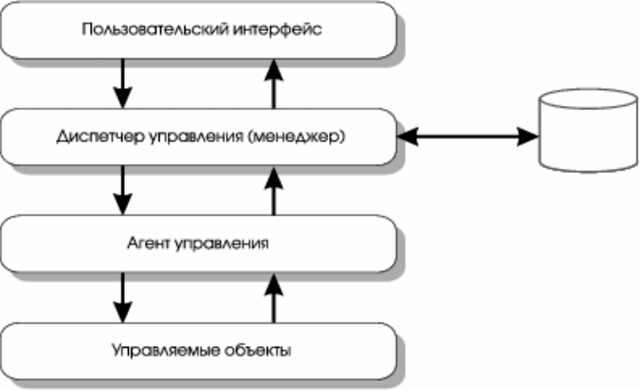 Агент управления. Для того, чтобы как-то взаимодействовать с объектом, необходим некоторый посредник. Маршрутизатор или приложение обычно не имеет "тумблеров". Однако имеется множество разных параметров, которые задают режим функционирования. Роль посредника между объектом и системой управления играет специальный компонент, называемый агентом. Его назначение — переводить команды системы управления на язык, понятный управляемому объекту, и наоборот.