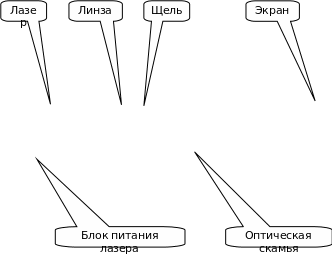 Экспериментальная установка состоит из оптической скамьи с набором рейтеров и приспособлений, источника монохроматического излучения (лазера), калиброванной щели и экрана наблюдения.