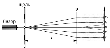 а) расстояния L от щели до экрана (измеряется в метрах при помощи линейки, закреплённой на оптической скамье, либо при помощи измерительной рулетки);