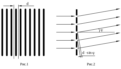 Прозрачной дифракционной решёткой называется совокупность большого числа параллельных, одинаковых по ширине и отстоящих друг от друга на одно и то же расстояние щелей, разделённых непрозрачными промежутками (рис.1). Расстояние d между серединами соседних щелей называется периодом решётки.