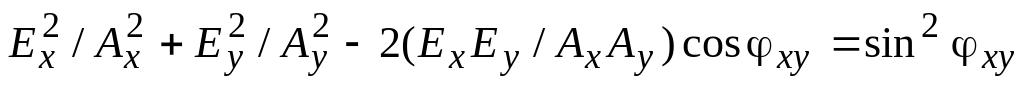 где φxy ‒ разность фаз ортогональных компонент, Ax и Ау ‒ соответствующие амплитуды. Исключая параметр времени t из уравнений, получим уравнение кривой второго порядка:
