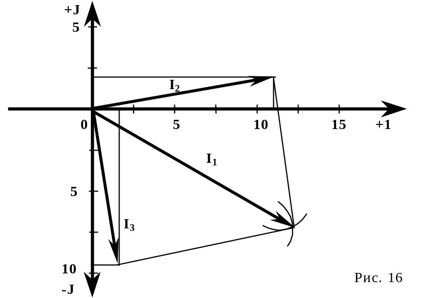 По векторной диаграмме можно произвести проверку правильности расчета токов путем сложения векторов I2 и I3 по правилу паралелограмма, сумма которых должна быть равна вектору тока в общей ветви I1 (рис. 16).
