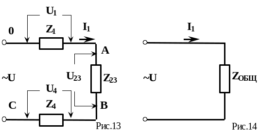 а схема приобретает вид, изображенный на рис.13. После этого оказалось, что сопротивления Z1 и Z23, соединены последовательно и могут быть заменены одним сопротивлением ZОБЩ , которое и будет являться полным сопротивлением всей цепи: