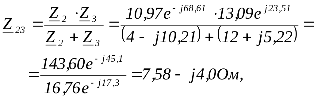 Приступаем к преобразованию схемы по законам цепей постоянного тока. Сопротивления Z2 и Z3 , как соединенные параллельно, можно заменить одним полным сопротивлением Z23, которое находится по формуле