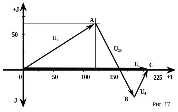 Векторную диаграмму напряжений для контура (см. рис.13) можно построить по методике, описанной выше для токов (см. рис.16). Откладывая действительные и мнимые части комплексных падений напряжений на сопротивлениях Z1, Z23 и Z4, строим вектора U1, U23 и U4 напряжений (см. рис.18). Методом засечек находим сначала сумму падений напряжений U1 + U23 = U123, а затем, суммируя U123 + U4 = U, разность потенциалов между точками 0 и С, которую определит вектор напряжения источника питания U.